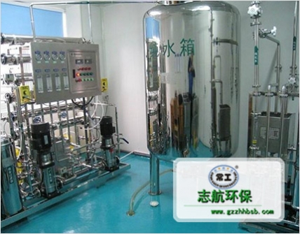 原水→原水加壓泵→多介質(zhì)過(guò)濾器→活性炭過(guò)濾器→軟水器→精密過(guò)濾器→第一級(jí)反滲透→PH調(diào)節(jié)→中間水箱→第二級(jí)反滲透(反滲透膜表面帶正電荷)→純化水箱→純水泵→紫外線殺菌器→微孔過(guò)濾器→用水點(diǎn)
