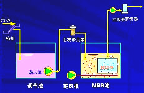 以膜組件取代傳統(tǒng)生物處理技術(shù)末端二沉池,在生物反應(yīng)器中保持高活性污泥濃度,提高生物處理有機負荷,從而減少污水處理設(shè)施占地面積,并通過保持低負荷減少剩余污泥量。主要利用沉浸于好氧生物池內(nèi)之膜分離設(shè)備截留槽內(nèi)的活性污泥與大分子有機物。