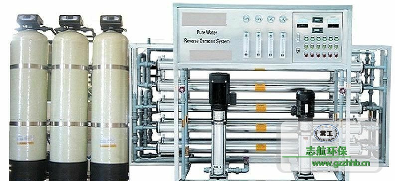 原水加壓泵→多介質(zhì)過濾器→活性炭過濾器→軟水器→保安過濾器→第一級反滲透機→第二級反滲透機→儲水罐→純水輸送泵用水點